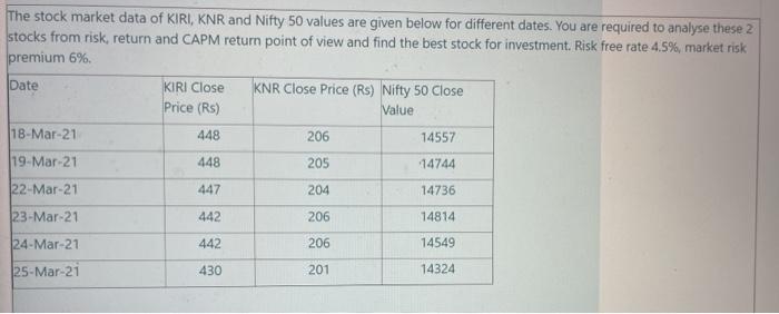 The Stock Market Data Of Kiri Knr And Nifty 50 Chegg Com